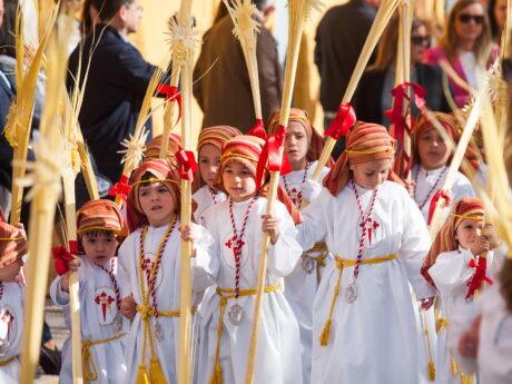 La Semana Santa es una fiesta religiosa que dura una semana. Empieza el Domingo de Ramos y termina el Domingo de Resurrección. Las fechas cambian cada año, dependiendo de la luna llena y la llegada de la primavera. En esa semana las calles se llenan de procesiones que están formadas por los «pasos», una estructura de madera de gran tamaño con figuras religiosas de Jesús o la Virgen. Estos «pasos» pasean por las calles gracias a que muchas personas cargan su peso en sus hombros. A estas personas  se les llama «costaleros/as».